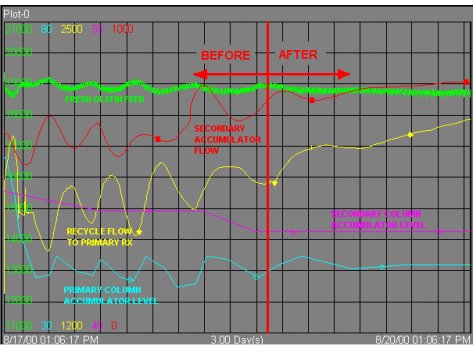 Figure 10 shows the plant’s oscillatory behavior before PID tuning optimization and then the plant’s improved and more stable behavior after PID tuning optimization. The increase in stability and removal of the oscillations enables the plant to push against operating constraints and thereby achieve higher production rates. Figure 11 shows the increase in the plant’s production rate and also the improvement in the plant operation because of reducing upsets and problems caused by poor control. After implementing the process control optimization and APC, a noticeable increase in operating efficiency and plant throughput could be successfully demonstrated.