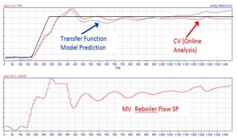Most control systems today have the capability for archiving historical data for several years. The long-term data trending and archiving is adequate for the design of APC schemes, especially for APCs with a slow dynamics with settling times in the range of 20 minutes to over 4 hours. This settling time range covers most chemical processes. Figure 5 shows real plant data collected from a plant’s data historian. The reboiler steam flow was pulsed and the process data was used to identify the process model parameters CVs MVs between the reboiler steam flow and the distillation temperature. This whole identification process was completed in less than ten minutes.
