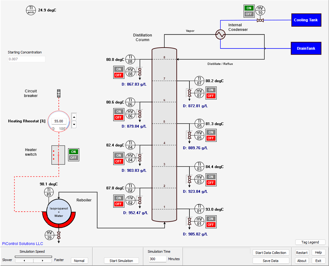 Moreover, the PiDistill-B Lite simulator allows simulation of batch distillation for mixtures with different components, different starting concentrations, and heat duty. The users can fearlessly play with the distillation column, change the conditions in real-time without no possibility of process or plant problems or a shutdown.  It converts any computer into a batch distillation plant real-time process simulation tool where users can change operating conditions and observe how these changes will affect complete distillation unit performance, all in real-time mode.  PiDistill-B Lite, as a practical batch distillation column simulator can mimic all typical behaviors of a distillation process providing valuable knowledge, understanding and experience which students can directly use in any separation industry.  With increasing emphasis on training, safety, reliability and stricter compliance with industry regulations PiDistill-B Lite is expected to be an essential educational simulation tool in modern chemical engineering subjects and laboratories for all technical universities and colleges worldwide.