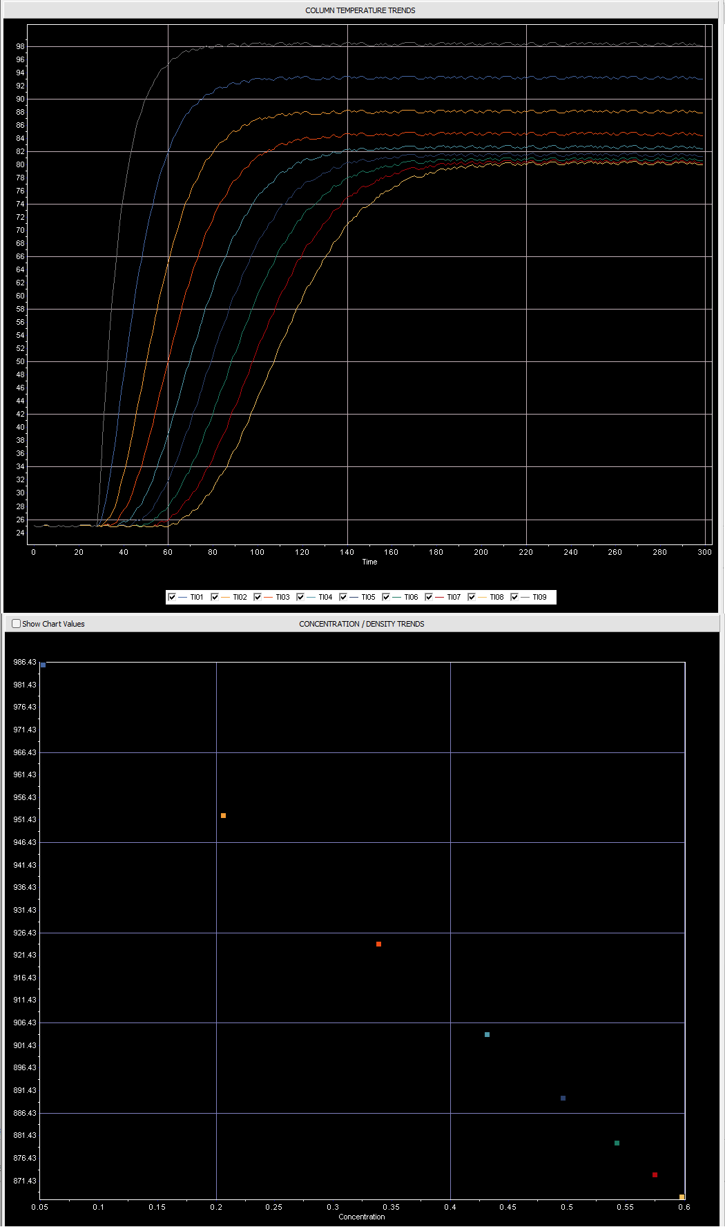 PiDistill-B Lite consists of batch distillation column separation process, reboiler and a condenser simulation, as shown on Figure 1.  It allows to each student and/or professor to change (increase and/or decrease) process variables, such as: starting concentration of mixture, heating and cooling to observe how these changes affect batch distillation temperature and concentration profiles. Users can learn and understand how to run the batch distillation column with a total reflux.  They can also observe the trends of all measured variables, such as: temperatures, densities and concentrations and save them in the spreadsheet-based data file for further analysis and study.  This powerful option gives them better and more simplified approach for calculation of theoretical heat and mass balance equations, McCabe-Thiele diagram, Total reflux ratio, or even for empirical static and/or dynamic transfer function and other model identification.  The users can easily compare their calculation results with the simulator step-tests and saved data.
